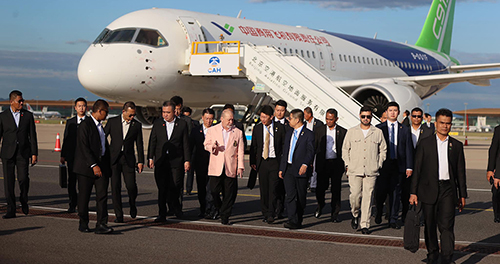 2024年3月12日,中国自主研制C919客机和ARJ-21客机历史性首度抵达梳邦机场。当时抵马的C919,是中国商用飞机有限责任公司第5架C919原型机,编号B-001F;至于ARJ-21则是来自商飞快线,注册编号B-3322。国家元首苏丹依布拉欣陛下也亲自登机参观,象征民航合作开启新篇。这不仅是一趟航程,更是一种信任的飞行,也寓意着两国未来开拓民航客机合作的前景与潜能。